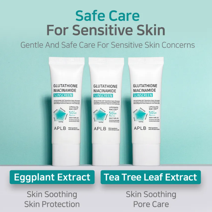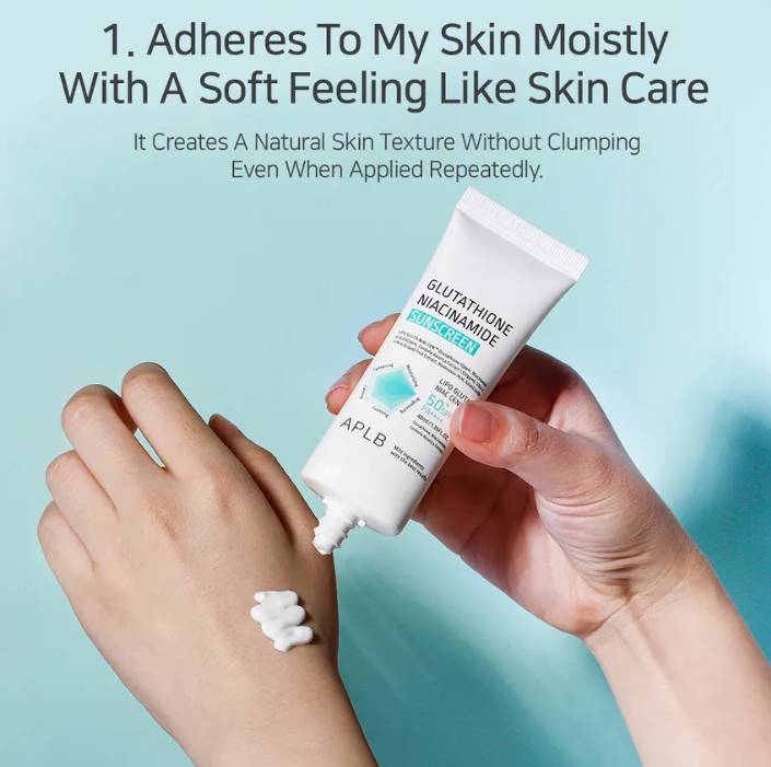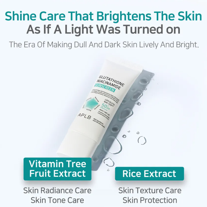 El APLB Glutathione Niacinamide Sunscreen es un protector solar químico de amplio espectro con SPF50+ PA++++, diseñado para proteger la piel de los daños causados por los rayos UV y otros agresores externos. Su fórmula ligera ofrece un acabado natural sin dejar tono blanco y se absorbe sin dejar grumos.