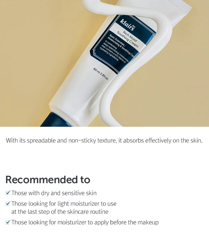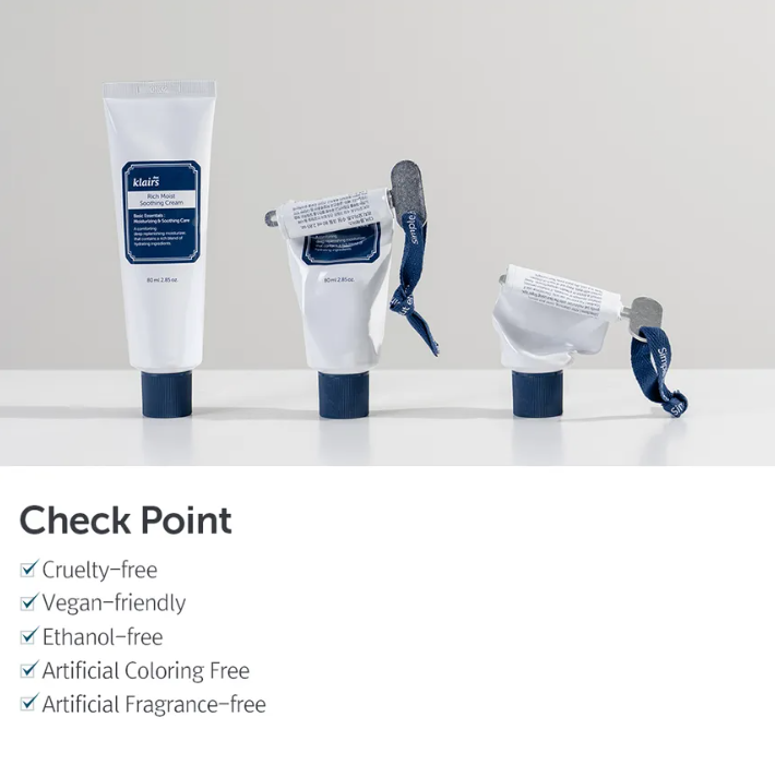 La Dear, Klairs Rich Moist Soothing Cream JUMBO es la versión renovada y ampliada de la popular crema calmante de la marca. Ahora con 20 ml adicionales, viene en un envase tipo tubo suave con tapa a rosca para evitar derrames y facilitar su uso. Su empaque renovado es ecológico, fabricado con papel reciclado y tinta de soya, sin laminado, resaltando el compromiso de la marca con el medio ambiente.