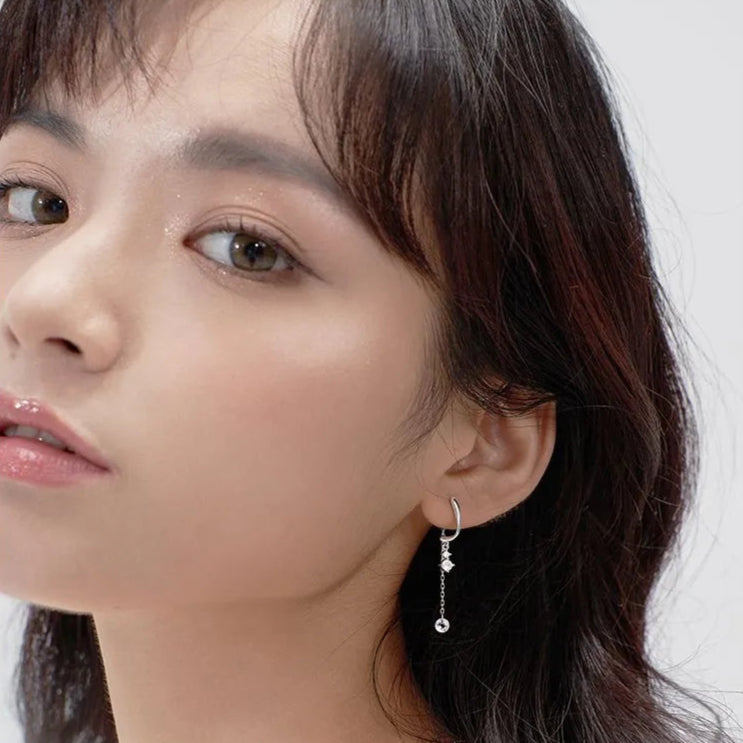 Diseñados para destacar desde todos los ángulos, los Destellos en Cadena combinan elegancia moderna con un toque de brillo único. Su diseño frontal incluye dos delicadas circonitas, mientras que una cadena posterior de plata cae sutilmente detrás de la oreja, finalizando con una tercera circonita brillante que se balancea suavemente con el movimiento.