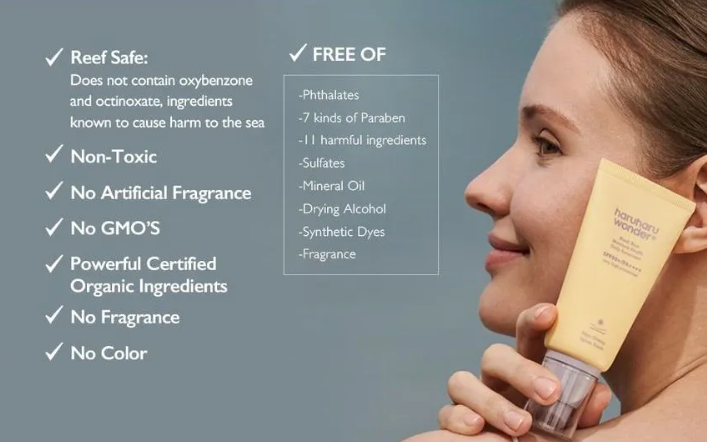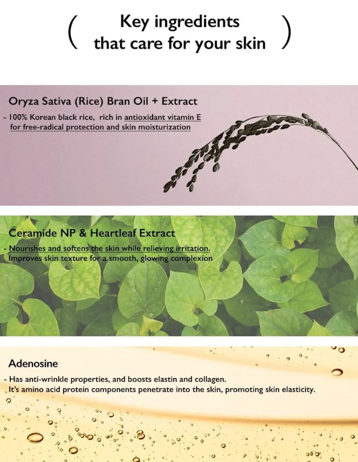 Está infundido con aceite y extracto de arroz negro, conocido por sus propiedades hidratantes y antioxidantes, que ayudan a mantener la piel nutrida mientras la protege del sol. Además, está enriquecido con ceramida NP, extracto de hoja de corazón, adenosina y niacinamida, que calman, iluminan y mejoran la elasticidad de la piel.
