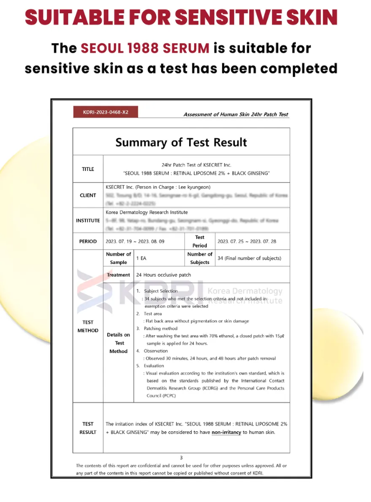 El SEOUL 1988 Serum de KSECRET es un sérum antienvejecimiento formulado con 2% de liposoma de retinal y 58% de extracto de ginseng negro, ideal para pieles maduras que buscan mejorar la elasticidad, el tono y la textura de la piel.
