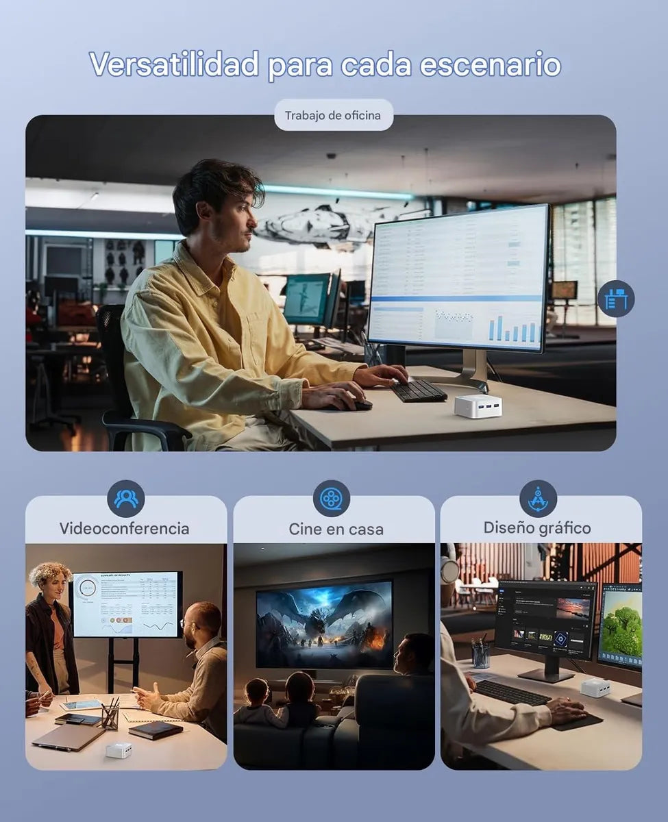 La Mini PC AceMagician T8Plus combina rendimiento, eficiencia y tamaño ultra compacto. Equipada con el procesador Intel N100, 12 GB de RAM LPDDR5 y un rápido SSD de 256 GB, es perfecta para tareas de oficina, clases virtuales, streaming en 4K y más.